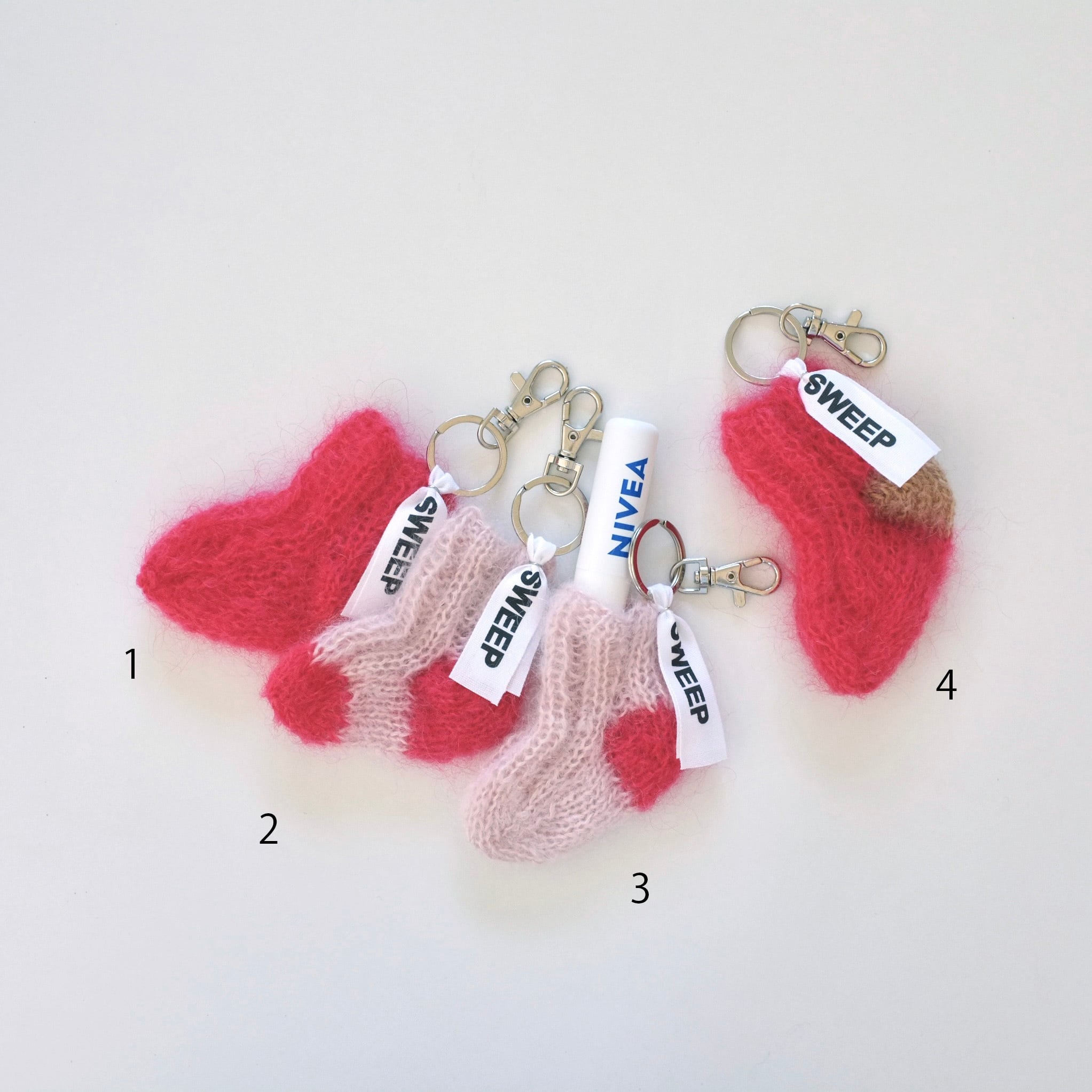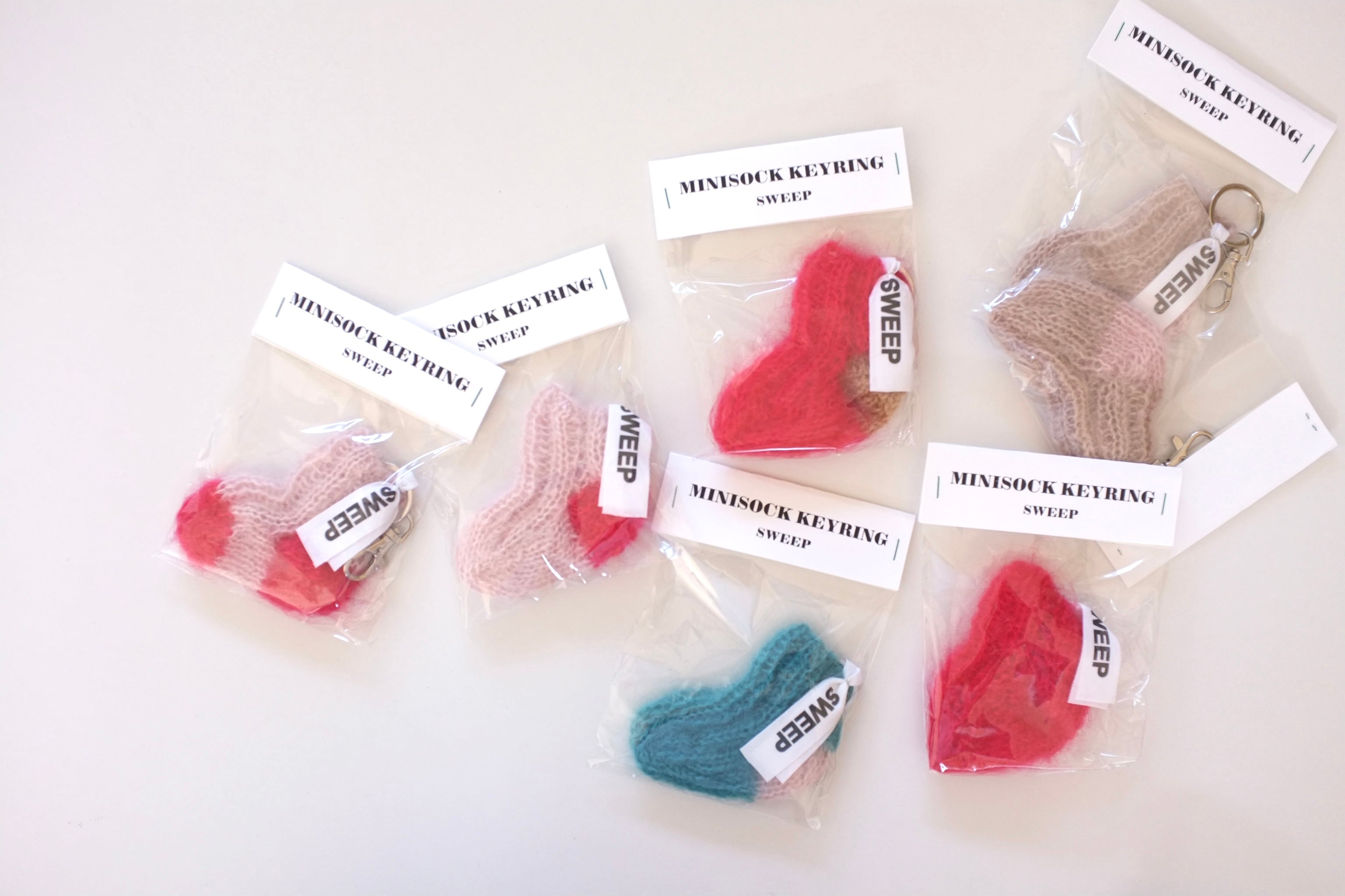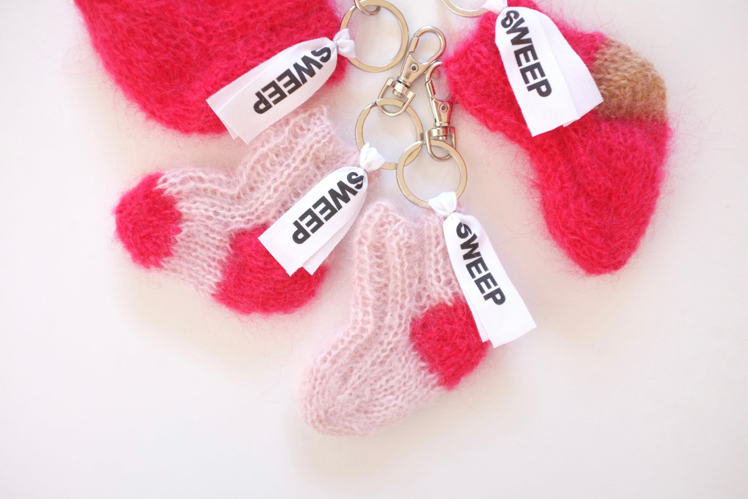 手編みのミニソックのキーリング。