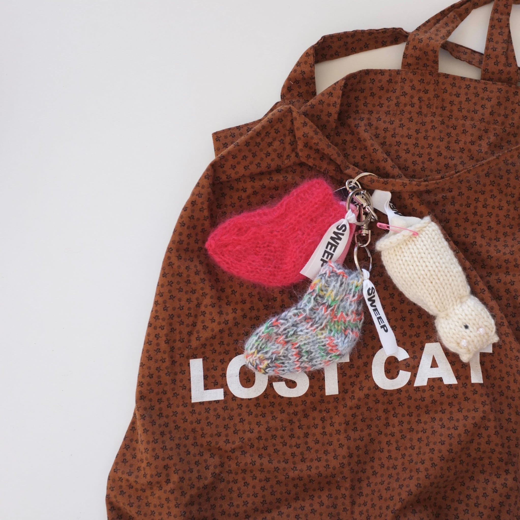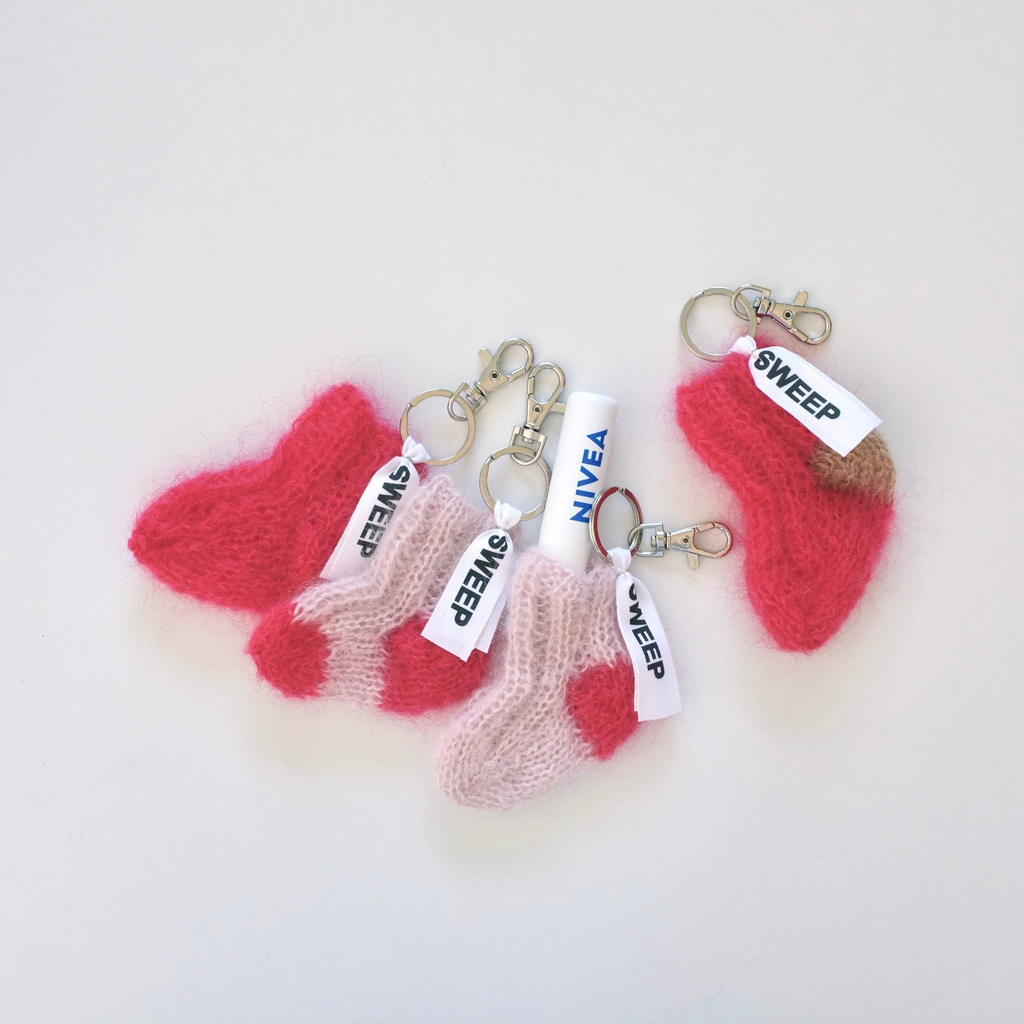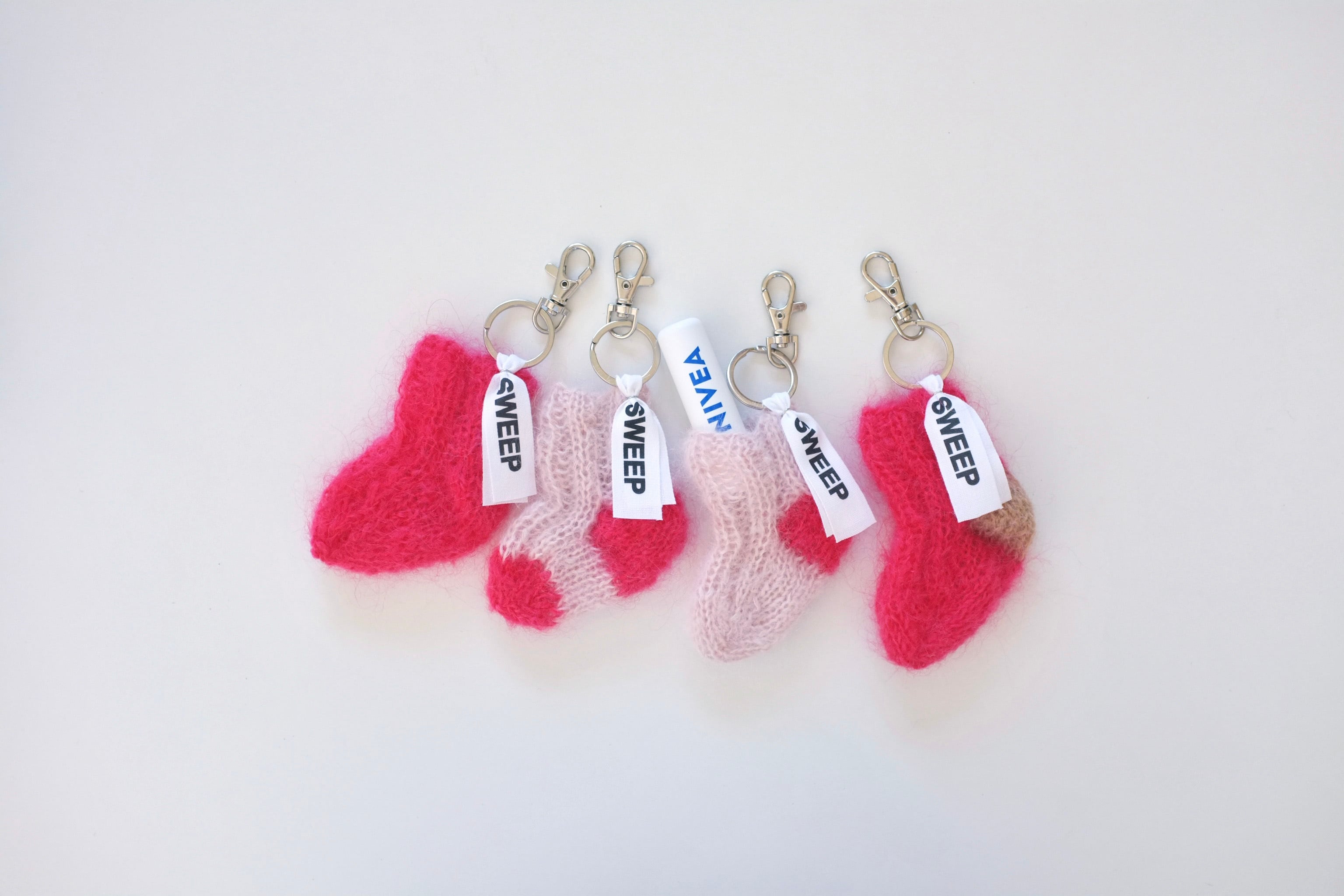 手編みのミニソックのキーリング。