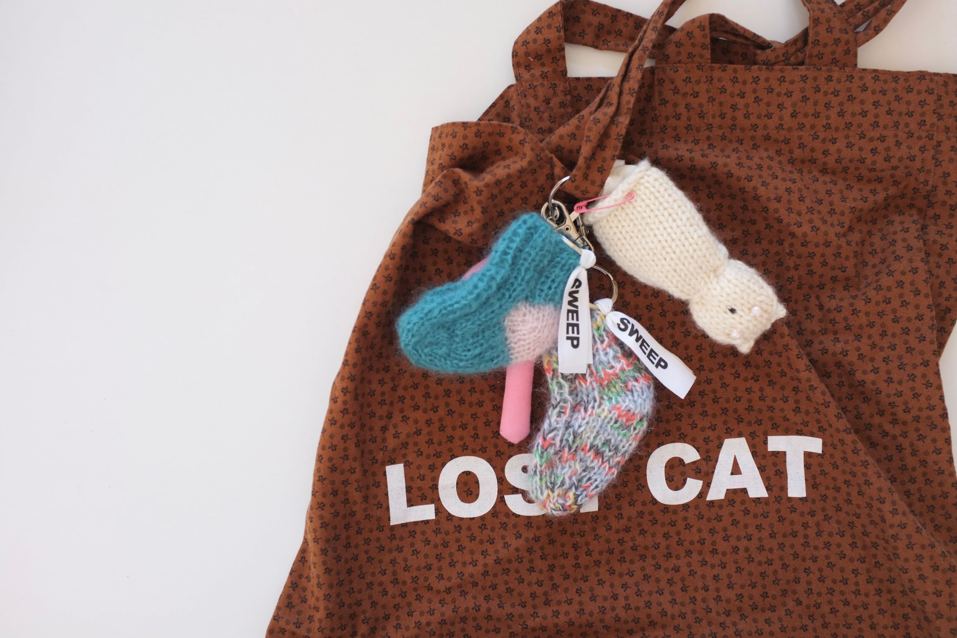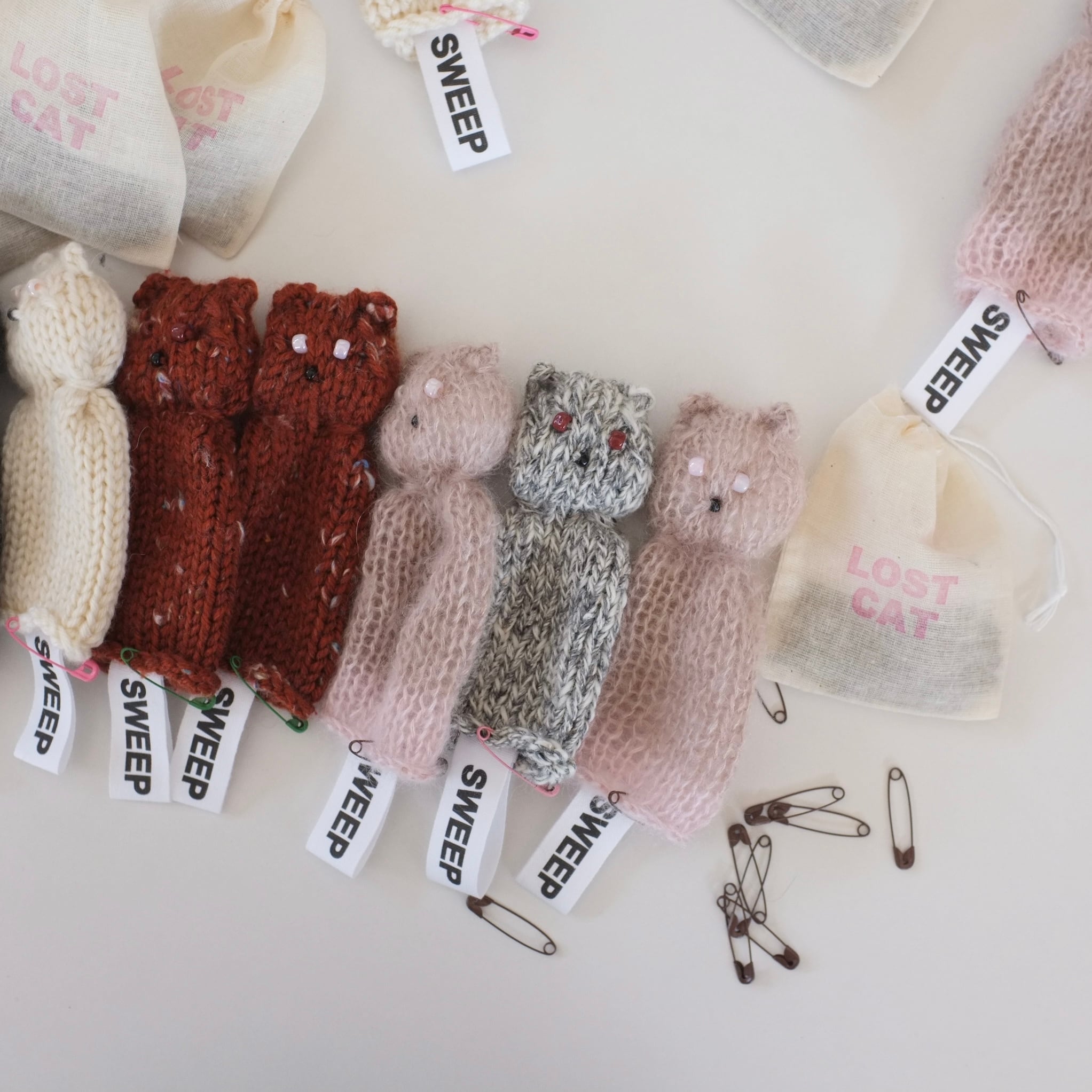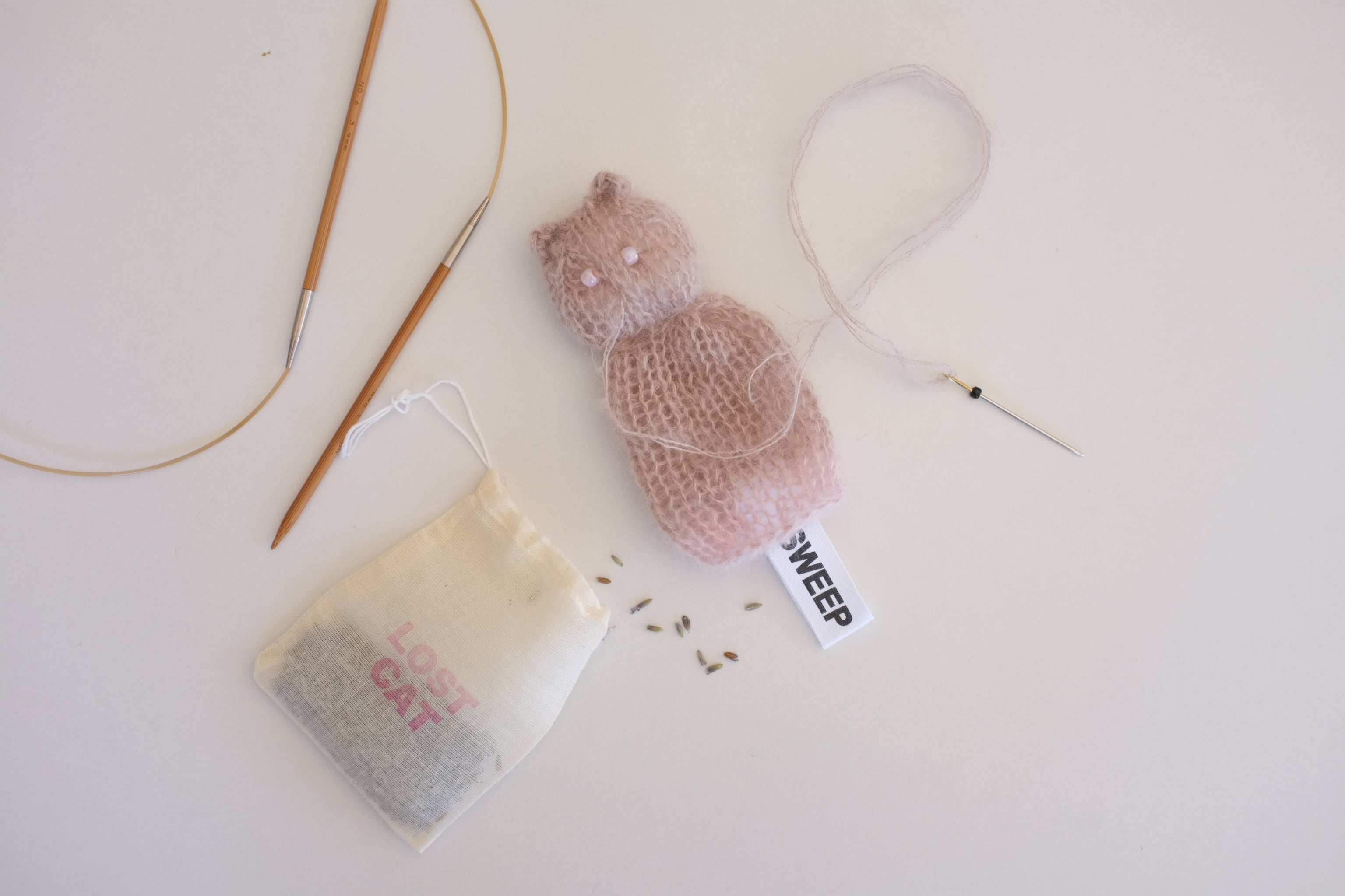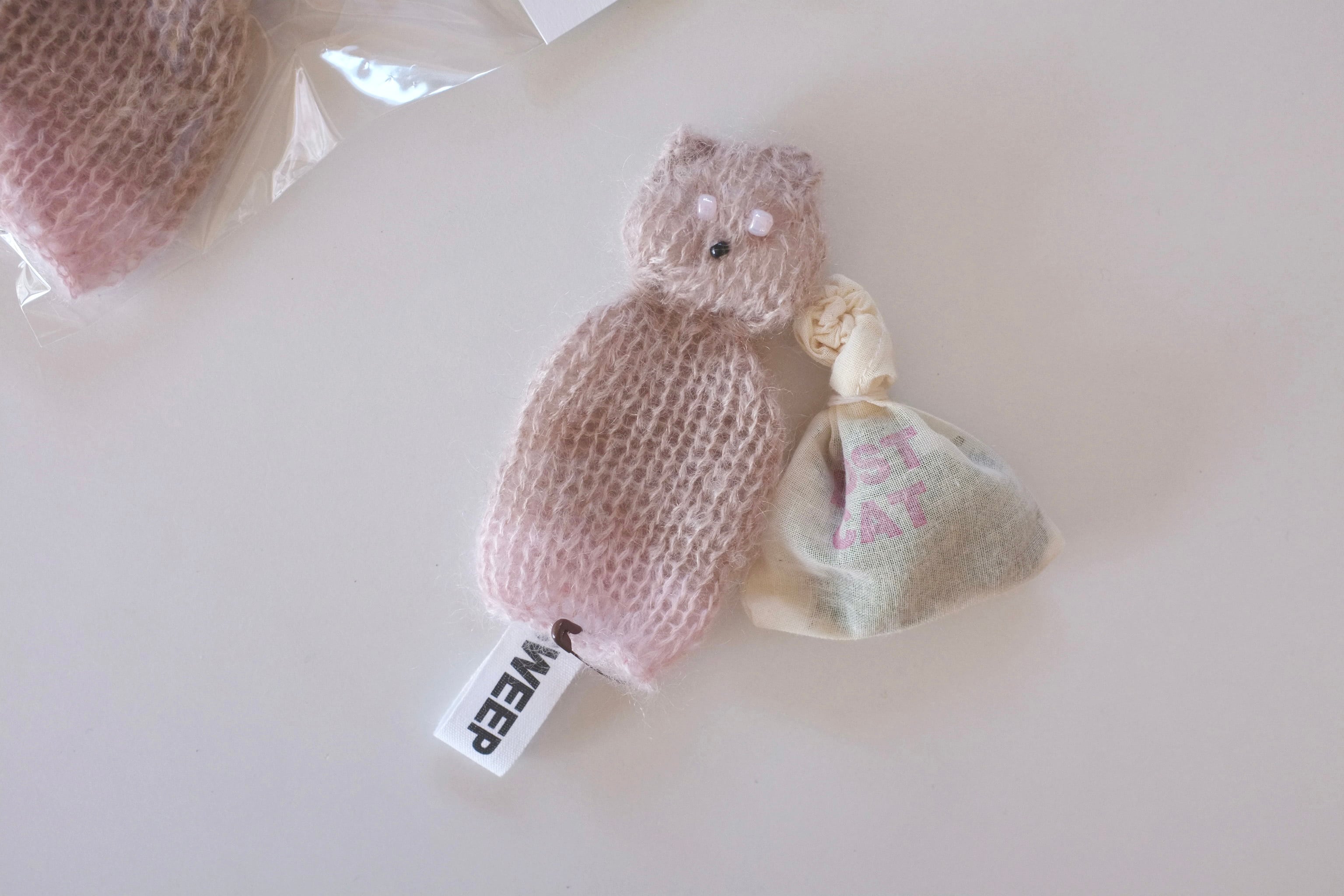 オールハンドニッティングで編まれた猫のサシェ。
