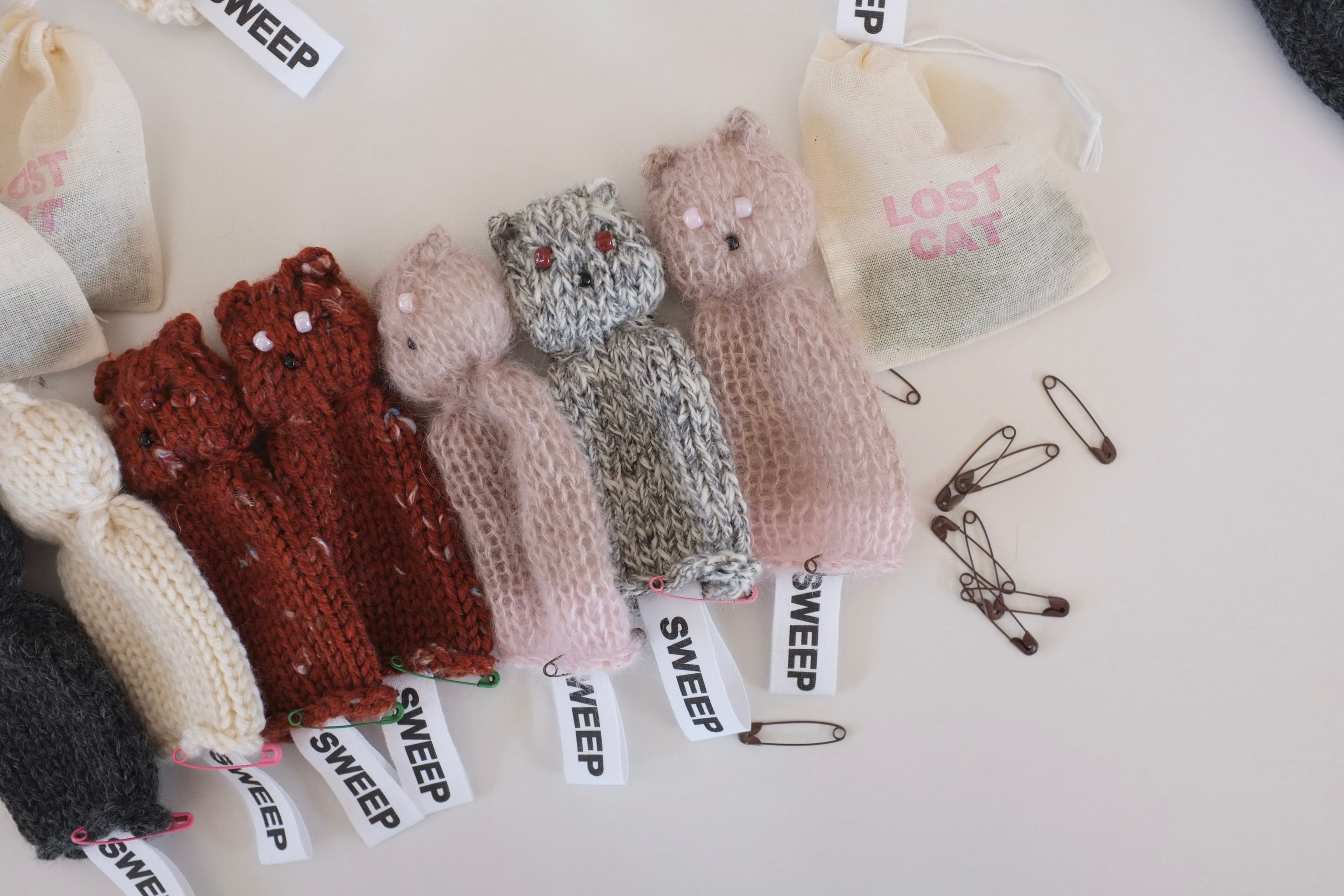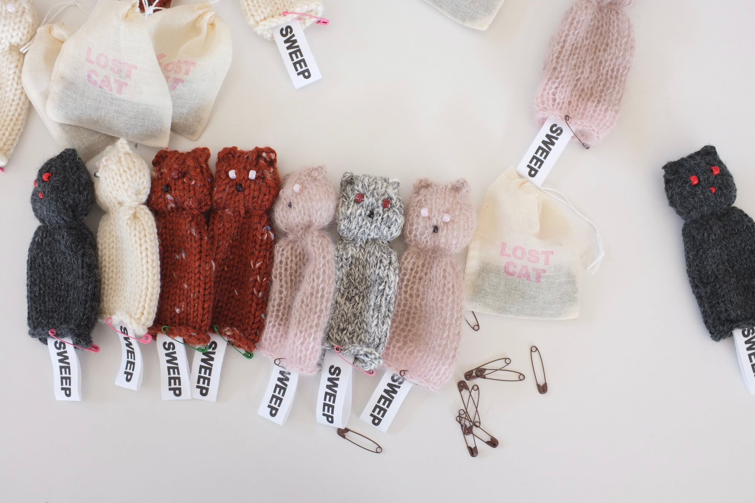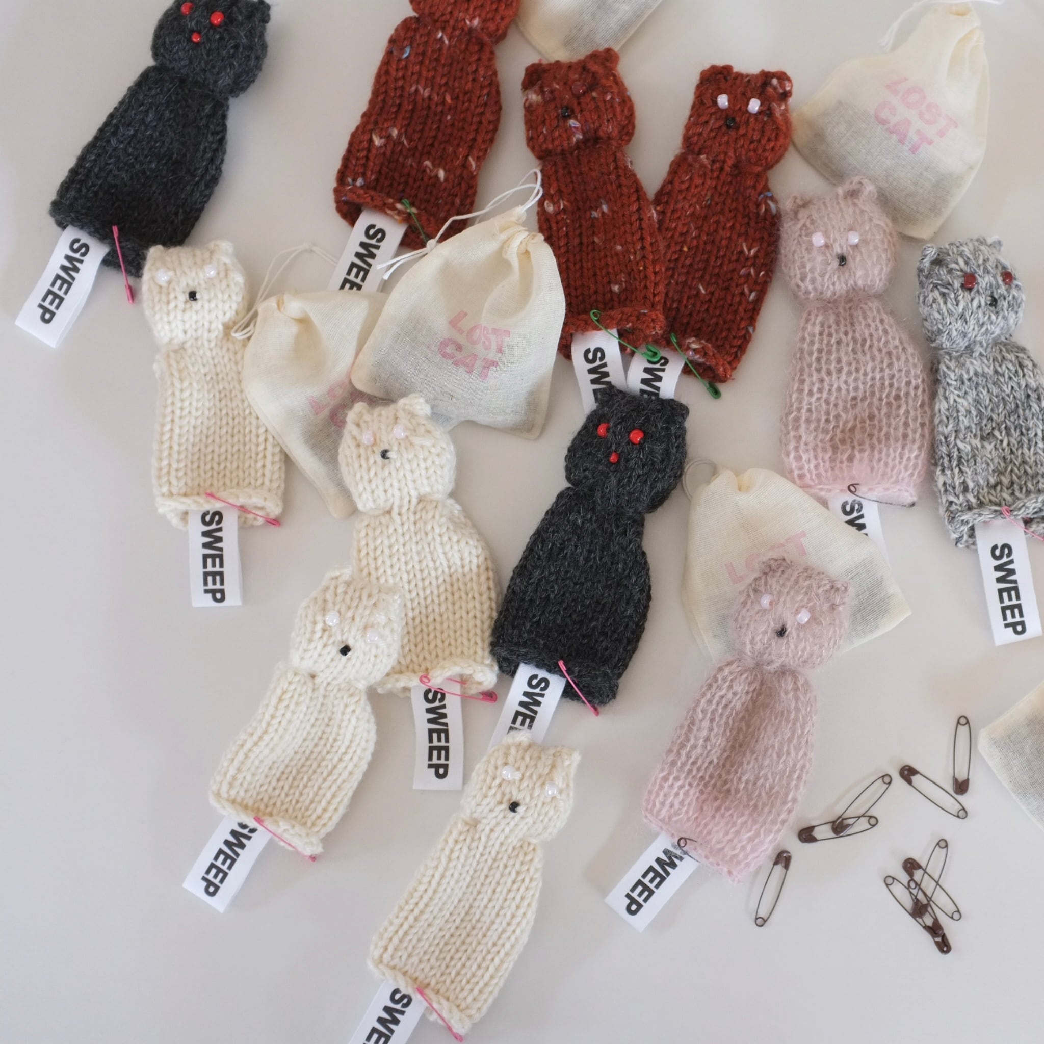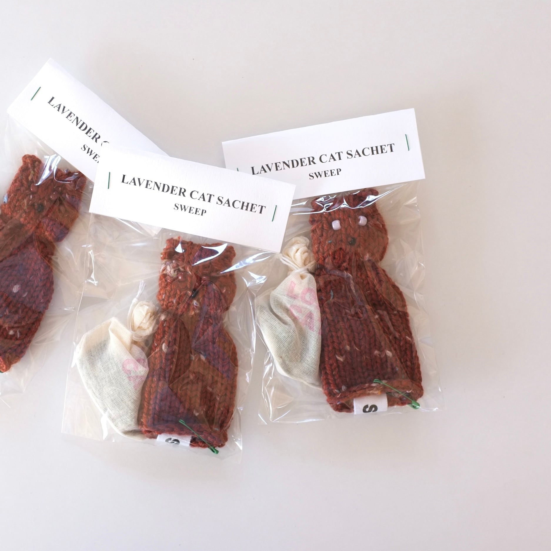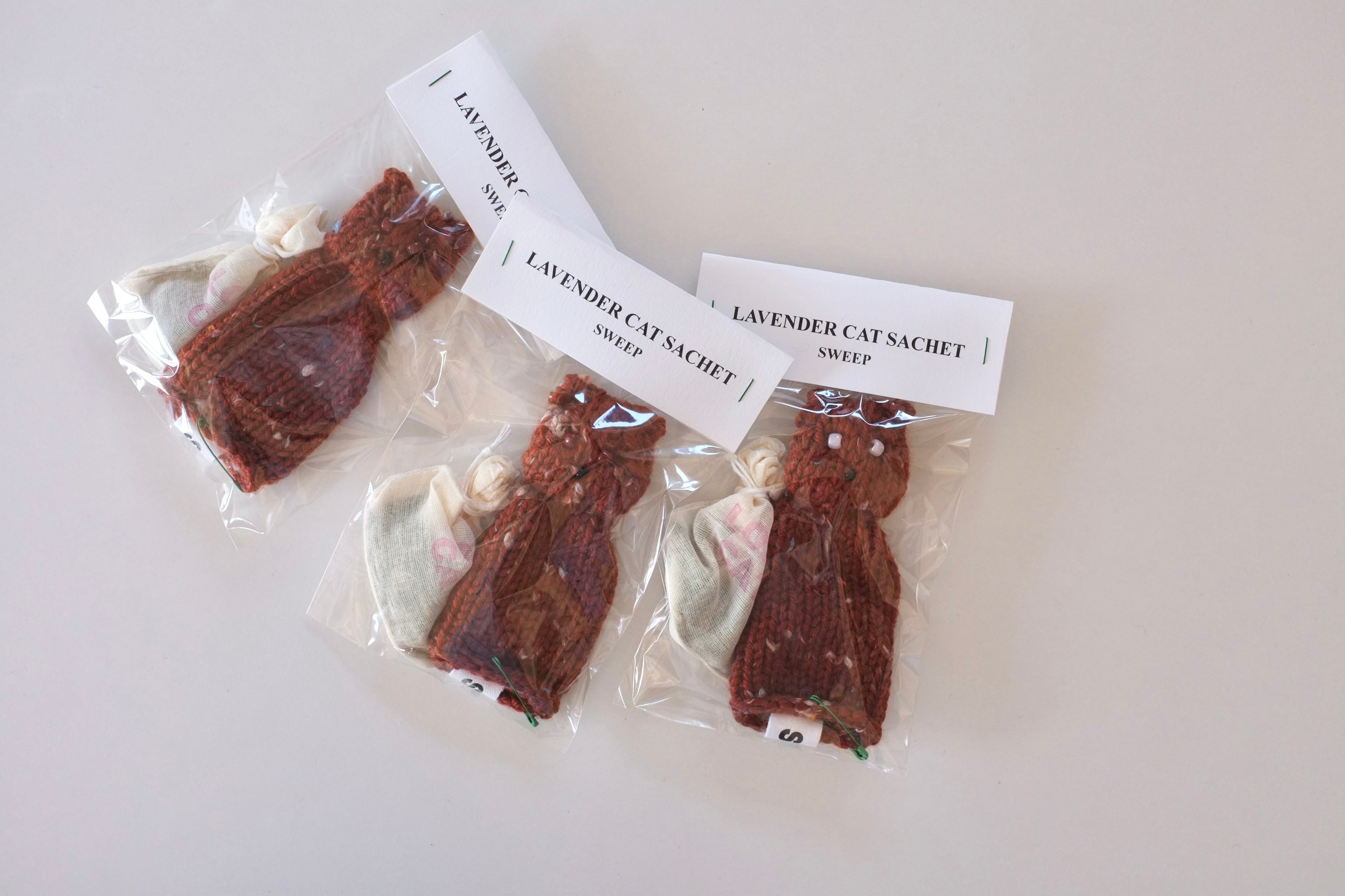 オールハンドニッティングで編まれた猫のサシェ。