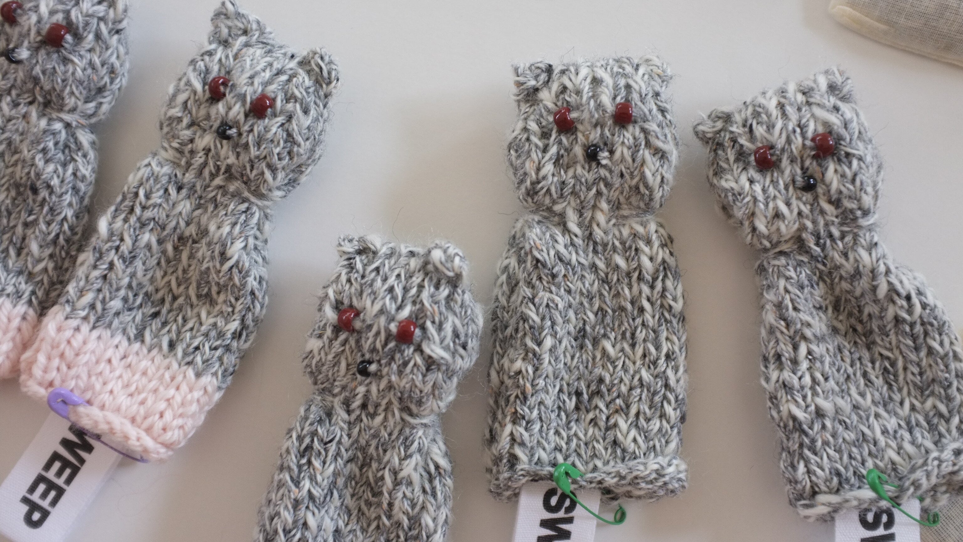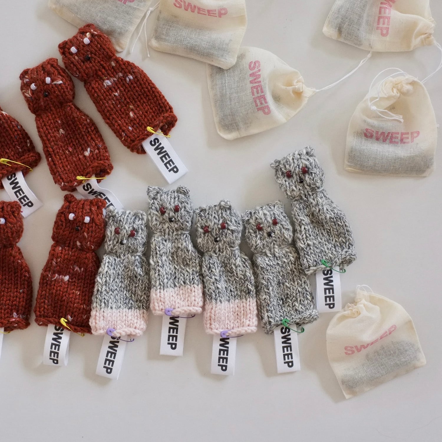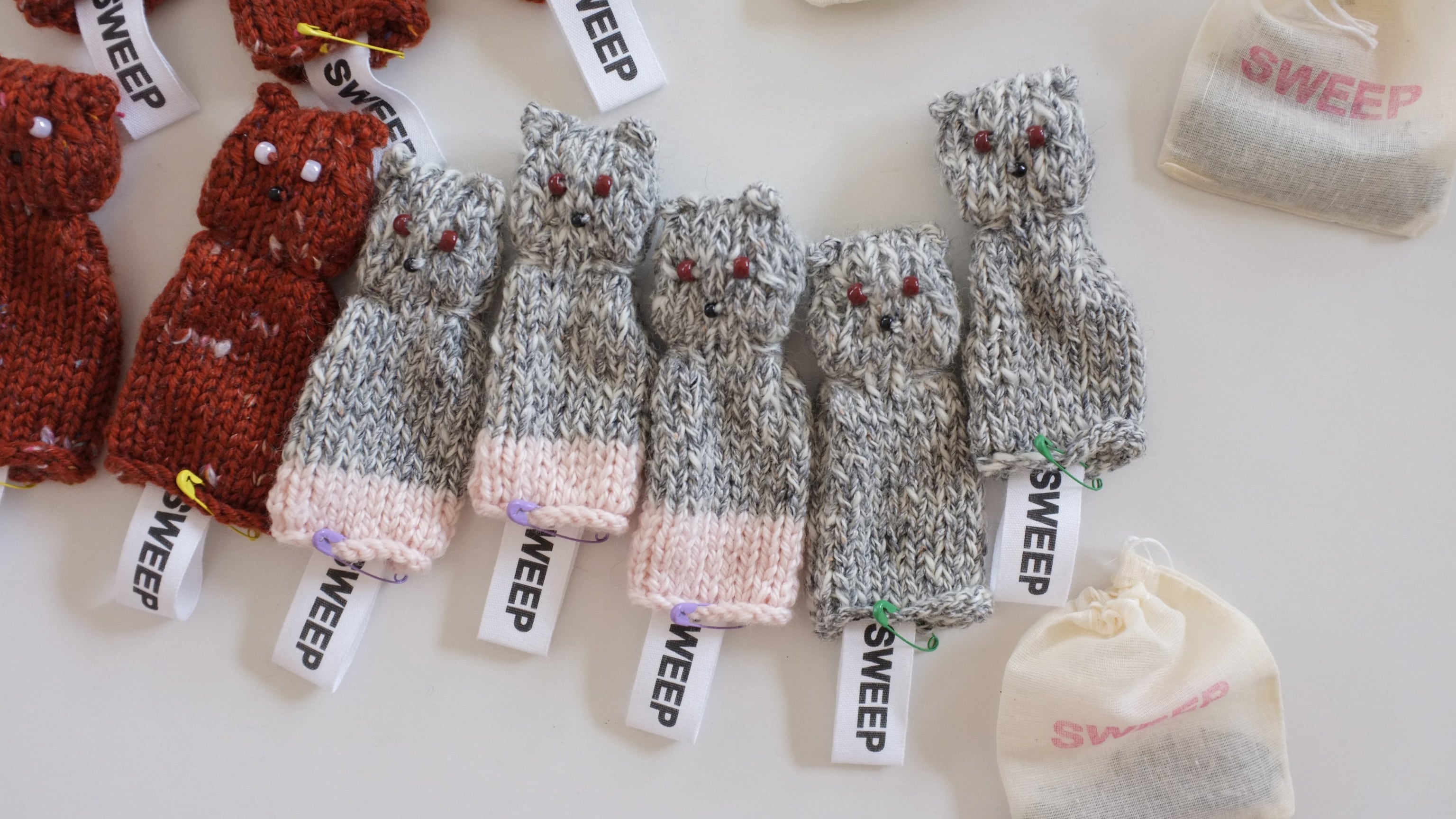 オールハンドニッティングで編まれた猫のサシェ。